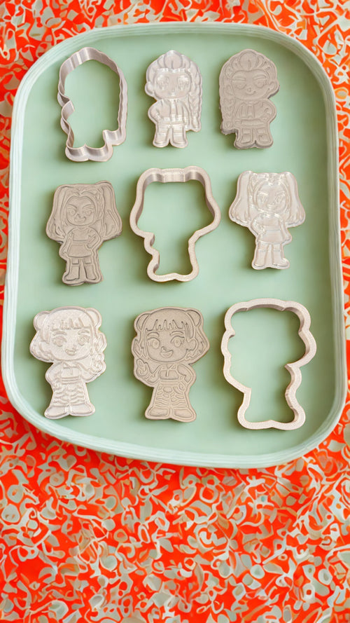 Complete set of 6 Huntrix K-pop character cutters and stamps featuring Rumi, Mira, Zoey, and the Huntrix trio. Perfect for creating fun character-themed cookies and clay designs.